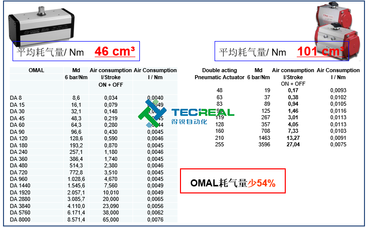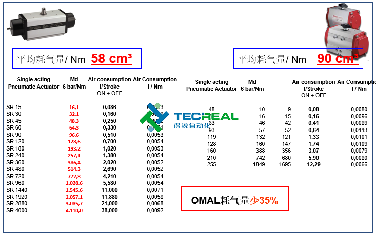 OMAL執(zhí)行器與Bray執(zhí)行器在耗氣量和重量上的對比