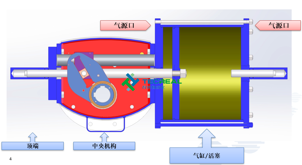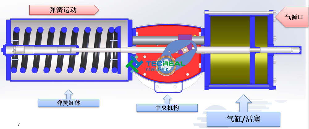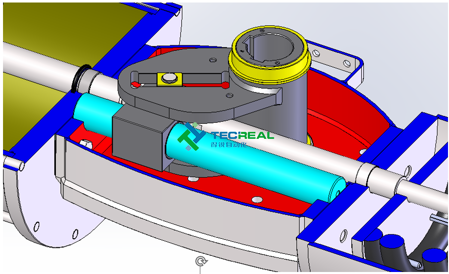 這種執(zhí)行機(jī)構(gòu),撥叉是位于中央機(jī)構(gòu)控制活塞運(yùn)動(dòng),但與氣缸活塞是分開的,這就解決了很多的密封問(wèn)題,并且允許使用各種氣體或是液體控制,而不是只有空氣作為氣源.例如:水,氣體甲烷等。