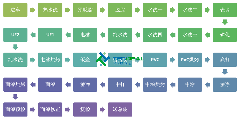 想要做好汽車涂裝工藝中的閥門選型,我們就要先搞清楚汽車涂裝的工藝流程(下圖是汽車涂裝的工藝流程圖)。
