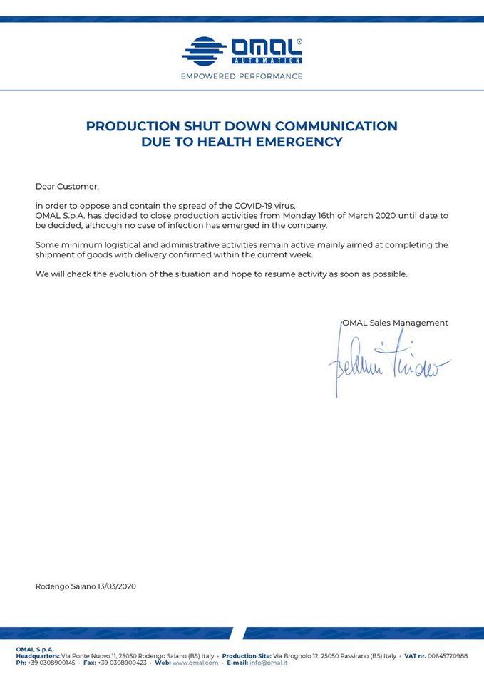 3月13日,OMAL正式宣布,為了員工身體安危,響應(yīng)意大利政府號召,關(guān)閉產(chǎn)品生產(chǎn)線。