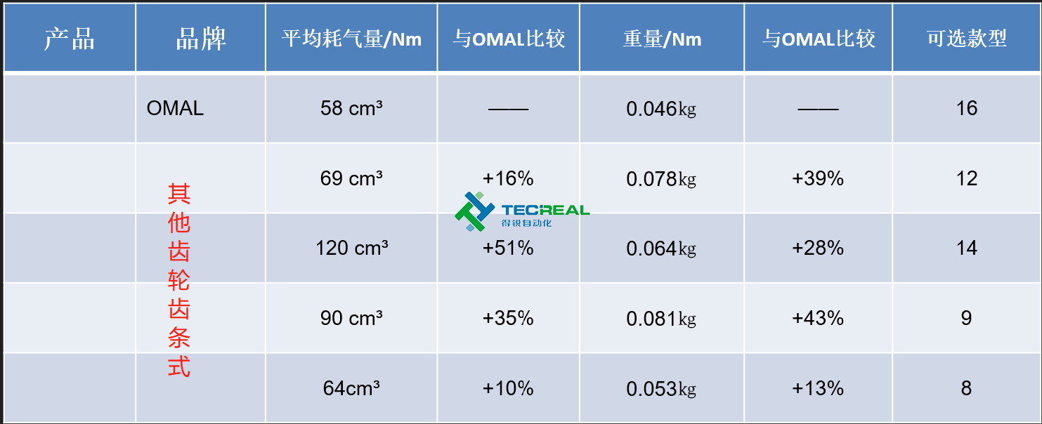 我們再多選取幾款市面上常見的齒輪齒條式氣動執(zhí)行器,在耗氣量和重量上與OMAL的撥叉式結(jié)構(gòu)對比。從下圖的對比結(jié)果可以看到,齒輪齒條式結(jié)構(gòu)的執(zhí)行器無論是在耗氣量和重量上大于撥叉式結(jié)構(gòu)。
