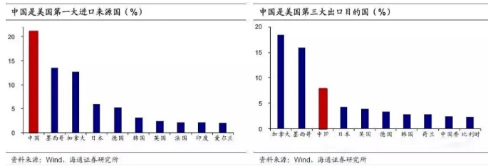 首先,我們從大的方面講。據(jù)2016年的數(shù)據(jù),中國是美國的第三大出口目的國,也是美國的第一大進(jìn)口來源國。對中國而言,美國是中國的第一大出口目的國,占中國總出口的18.5%,也是中國第六大進(jìn)口來源國。
