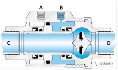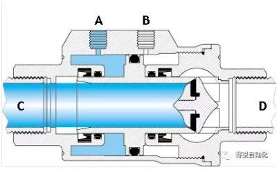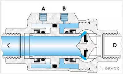當(dāng)“A”孔進(jìn)氣(“B”孔排氣)時(shí),活塞向“D”口移動(dòng)并壓在閥座密封上,此時(shí)閥門關(guān)閉。單動(dòng)常閉型的彈簧安裝在“A”端腔室。在非控制時(shí),活塞是壓在閥座上,所以其最常用的是關(guān)閉位。