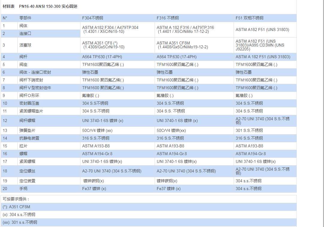 對于閥體、活塞球、閥桿需采用特殊的不同材料,請與我們的銷售部門聯(lián)系