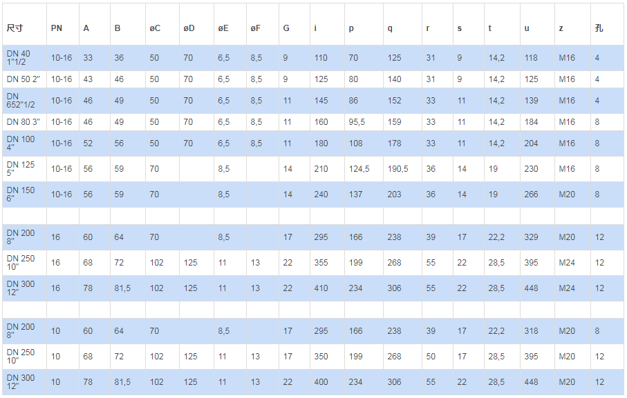 法蘭標準:PN 10=PN 16 公稱通徑從 DN 40 至 DN 150; PN 10 或 PN 16公稱通徑從DN 200 至 DN 300。